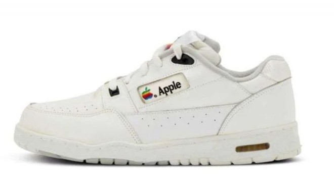 Beyaz ayakkabıların üzerinde Apple’ın gökkuşağı renklerindeki eski logosu yer alıyor.