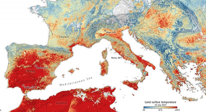 Bilim insanlarının arazi yüzeyi sıcaklıklarını baz aldıklarını belirten ESA, bu hafta sonunda İspanya’da hava sıcaklıklarının bile 44 dereceye ulaşmasının beklendiğini ve ‘arazi yüzeyi sıcaklıklarının’ İtalya'nın Roma kentinde 46°C'ye ulaşırken, İspanya'nın Madrid ve Sevilla kentlerinde sırasıyla 46 ve 47°C'ye ulaştığını kaydetti.