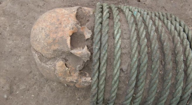 Ukrayna'nın Kiev kenti yakınlarında keşfedilen bin yıllık mezarda 107'den fazla iskelet bulunuyor. Boyunlarında halkalar ve ayaklarında kovalarla gömülmüş iskeletlerin bulunduğu bin yıllık bir mezarlık ortaya çıkarıldı. Independent Türkçe’den Alexander Butler’ın haberine göre Ukrayna'nın Kiev kenti yakınlarında keşfedilen ve bir pagan toplu mezarı olduğu düşünülen mezarda kemiklerin yanı sıra baltalar, kılıçlar, mızraklar, mücevherler ve tavuk kemikleri de bulundu. Yeni araştırmaya göre arkeologlar ayrıca taş bir sunağın yanı sıra bilezikler, boncuklar ve yumurta kabuğu gibi adak yiyeceklerin kalıntılarını da buldu.