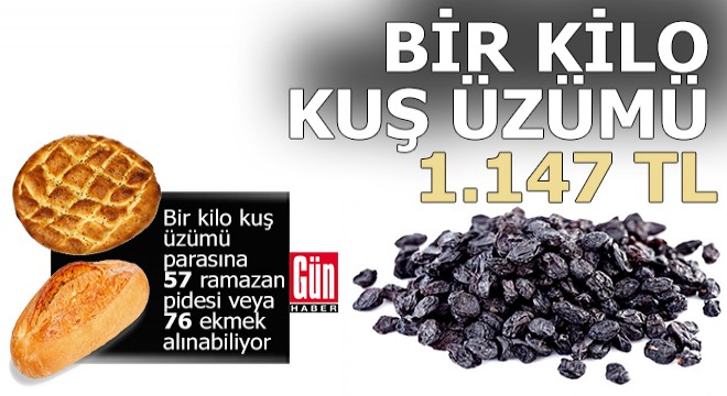 Antalya’da bir ekmek 15 TL’den satılıyor. Kilosu 1.147 lira olan kuş üzümü 76 ekmek parası ediyor. Türkiye Fırıncılar Derneği de 250 gram Ramazan pidesinin 20 liradan satılacağını duyurdu. Bir kilo kuş üzümü fiyatına 57 ramazan pidesi alabileceksiniz.