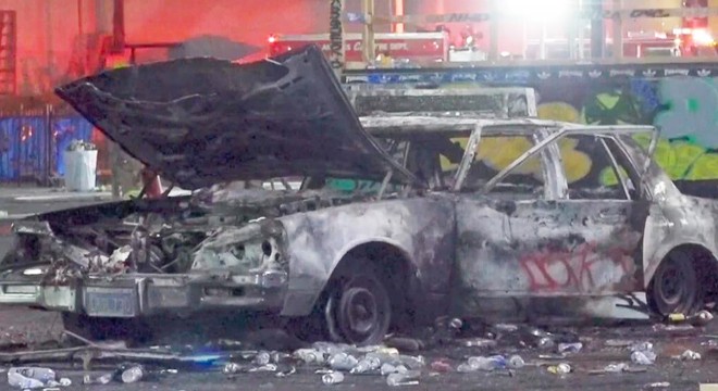 Kargaşaya neyin yol açtığı belli değil ancak olay yerinden yayınlanan videoda için için yanan bir araç ve otoparka dağılmış bariyerler görülüyor.
