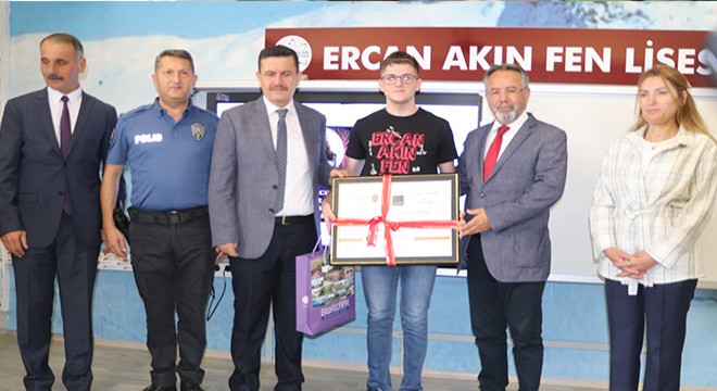 Özyeğin Üniversitesi İngilizce Bilgisayar Mühendisliği Bölümü'nü tam burslu olarak kazanan Ahmet Can Kiraz'a ödülü Vali Ali Arslantaş ve iş insanı Ercan Akın tarafından verildi.