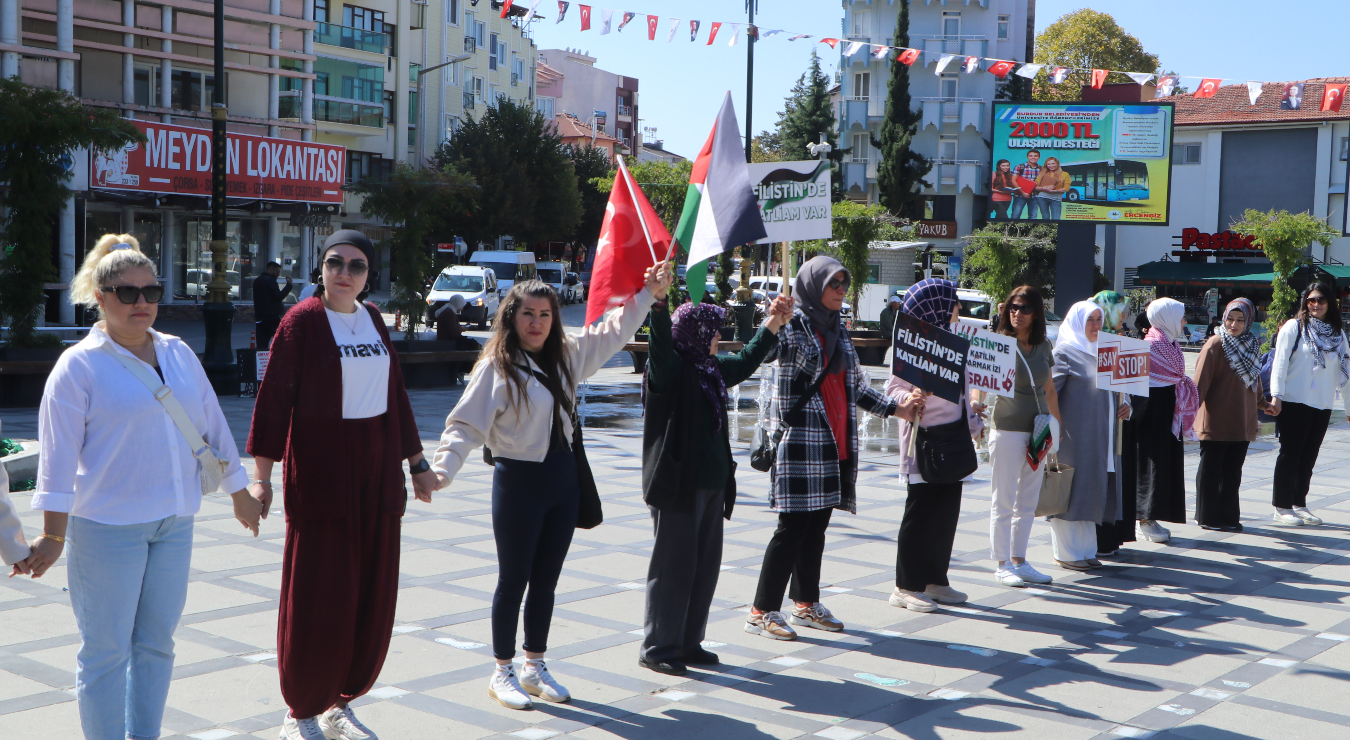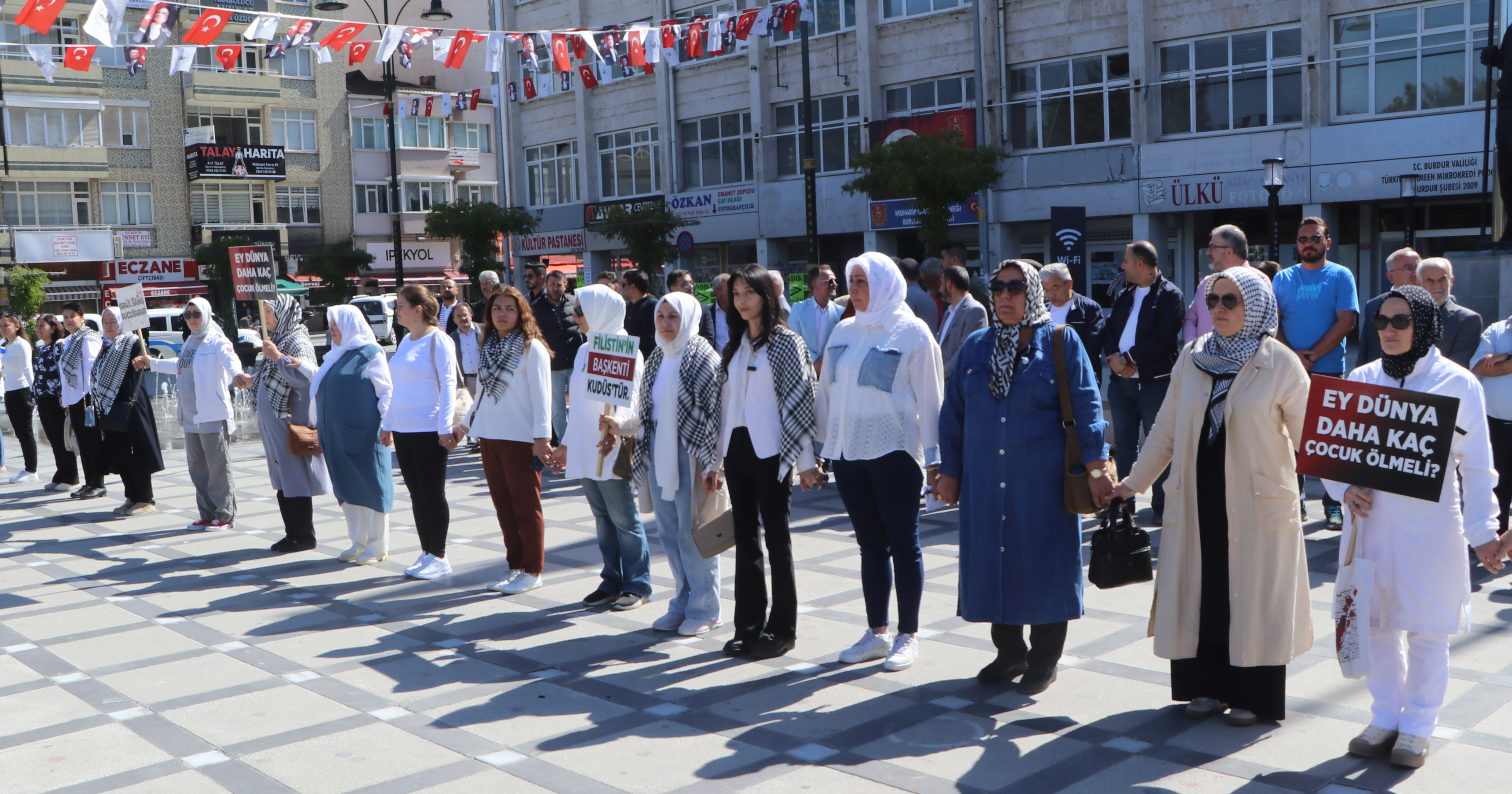 Cumhuriyet Meydanı'ndaki eyleme AK Parti İl Başkanı Mustafa Özboyacı, Merkez İlçe Başkanı Hüseyin Okan, belediye meclis üyeleri, il genel meclisi üyeleri ile partililer katıldı. Eylemde basın bildirisini okuyan AK Parti Kadın Kolları Başkanı Cennet Özalp Tanrıöver, "Bugün kadınlar olarak Gazze'nin sessiz çığlığına ses olmak için el ele verdiğimizi tüm dünyaya göstermek adına meydanlardayız. Bugün 81 ilde kurduğumuz bu zincir, Gazze'de evlatlarını kaybeden anne- babaların zinciridir. Öksüz- yetim bırakılan çocukların zinciridir ve insanlığını kaybetmeyen herkesin zinciridir. Biz 'Yaralıları mı kurtaracaktım, şehitleri mi taşıyacaktım ya da bir torba un mu bulmaya çalışacaktım? Yemin ederim eve tek bir torba un getirip, çocuklarımın karnının doyacağını bilsem, ölüme razı olurum' diyen Gazzeli annenin sesi olmak için, bu sesi dünyaya duyurmak için buradayız" dedi. Açıklamanın ardından eylem sona erdi.