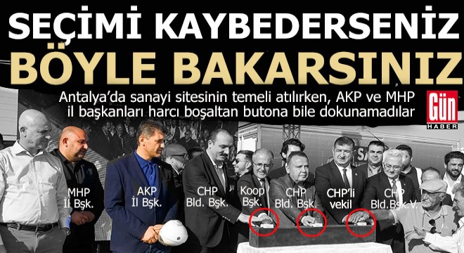 CHP’li belediye başkanları temeli atarken, Ak Parti İl Başkanı Ali Çetin (soldan üçüncü, elinde kask olan) ile MHP İl Başkanı Onur Temel (sağdan ikinci) temele harç dökecek olan butona göz ucuyla bakmakla yetindiler. Tören sonrası misafirler hazırlanan kokteylde bir araya geldi, sohbet etti.