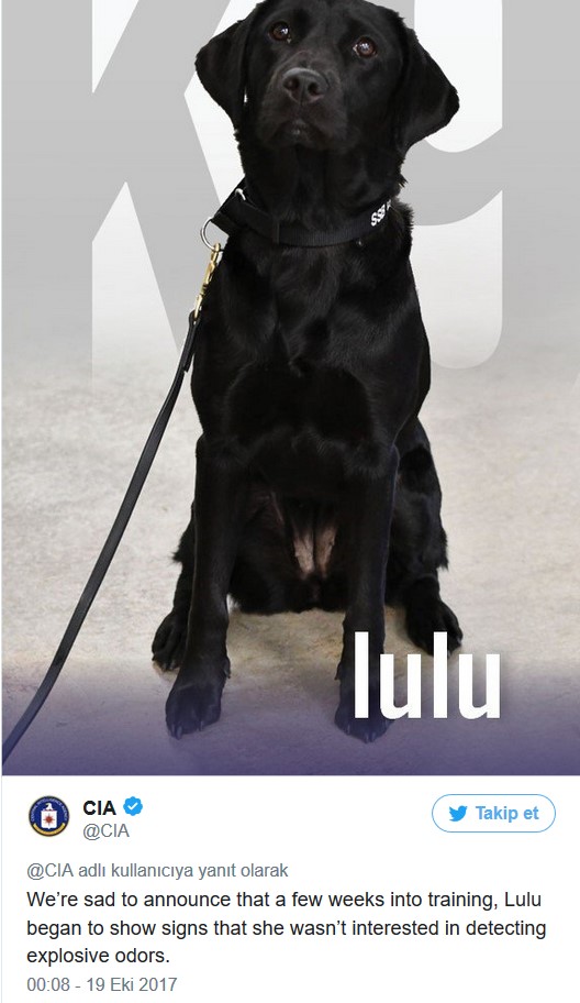 Labrador cinsi köpek Lulu, Amerikan Merkezi İstihbarat Teşkilatı'nın (CIA) en yeni üyelerindendi. Görevi, koklayarak patlayıcıları bulmaktı. Lulu haftalarca eğitim aldı ama hiçbir gelişme kaydedemedi. Görünüşe göre CIA'deki hayat ona göre değildi. Sonuç olarak 2017 K-9 eğitim programından çıkarıldı.