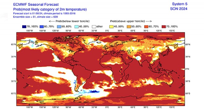 İstanbul Teknik Üniversitesi (İTÜ) Meteoroloji Mühendisliği Bölümü'nden Prof. Dr. Barış Önol, ECMWF sezonluk tahminlerine göre paylaştığı haritalarla, sonbahar ayları için de uyarıda bulundu. ECMWF'nin sonbahar aylarına ilişkin paylaştığı ve sıcaklık tahminlerini gösteren haritayı değerlendiren Prof. Dr. Barış Önol, "Kırmızı gezegen serisine son hızla devam ediyoruz. Bahar, yaz derken şimdi de sonbahar aylarının öngörüleri çok sıcak bir döneme işaret ediyor. Hem de Pasifik'te El Nino bitmiş, La Nina başlamışken. 1 Ekim'de başlayacak 'su yılı' için de bu sıcaklık tahminleri önemli. El Nino, nisan ayında bitti ve yazın La Nina'ya geçtik. 11 yıllık güneş döngüsünden genel radyasyon pik dönemde yüzde 0,1 kadar artıyor, onun etkisi de yaklaşık +0.2 santigrat derece" diye konuştu.