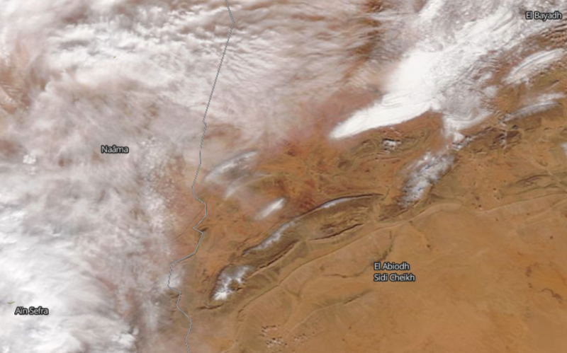 Fotoğrafçı Zinnadine Hashas, ortaya çıkan manzaraları kaçırmamak için denklanşörüne bol bol bastı ve bir daha uzun süre göremeyeceğimiz görüntüleri kayıt altına aldı. Kuraklık sınırının da altında yıllık yağış ortalaması bulunan Ain Sefra, çevresini saran kumdan oluşmuş Atlas Dağları içinde, deniz seviyesinden 1000 metre yüksekte bulunuyor. Yapılan ölçümlere göre kar yağdığı zamanda sıcaklık 12.4 santigrat dereceydi.