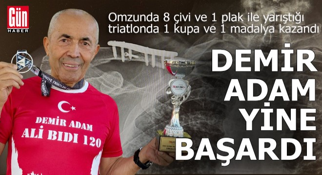 Omzundaki 8 çivi ve 1 plak olan Ali Bıdı, önce denizde 1,5 kilometre yüzdü, ardından 40 kilometre bisiklet sürdü. Sonrasında 10 kilometre koşan Ali Bıdı, Alanya Triatlonu Türkiye Kupası’nda 75-79 yaş kategorisinde ikincilik madalyası aldı.