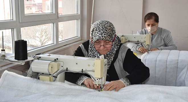 Eğirdir'de İl Milli Eğitim Müdürlüğü, Eğirdir Kaymakamlığı ve Eğirdir HEM Müdürlüğü iş birliğiyle usta öğreticiler, kursiyerler ve gönüllüler depremzedeler için uyku tulumu üretiyor.
