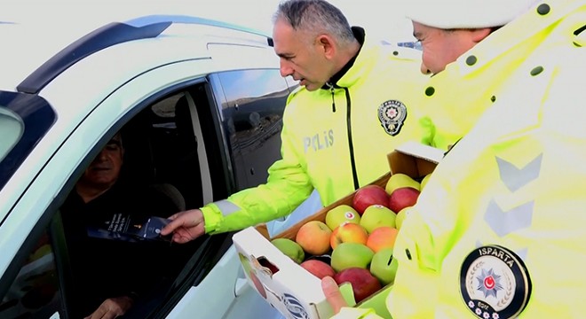 ISPARTA'nın Eğirdir ilçesinde çokça kazanın meydana geldiği yolda uygulama yapan polis ekipleri, sürücülere elma ikram ederek, uyarıcı broşürler dağıttı.