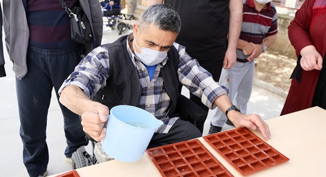 Özel bireyler tarafından üretilen sabunlar süslenerek engelli bireylere dağıtıldı.