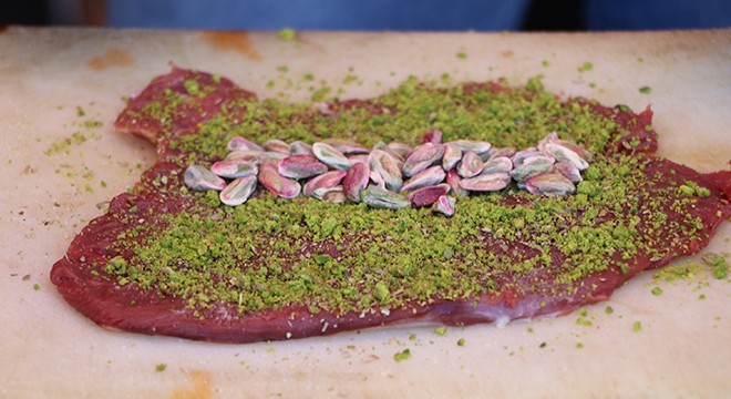 Antep fıstığının tatlılar dışındaki yemeklere de kullanılabildiğini göstermek istediğini söyleyen Necdet Kılıçoğlu, "Bu sezonumuz bizim fıstık sezonumuz. Biz de yeni bir inavasyon yaparak fıstıkla eti buluşturduk. Fıstıklı et dürümü ortaya çıkardık. Bizce müthiş bir şey oldu ve baya bir talep almaya başladık. Günde 20-30 porsiyon civarında satışımız var. Kuzunun budundan aldığımız kısmı ince ince kesip, dövecekle elden geçiriyoruz. İçine kekik, tuz, çekilmiş ve tane Antep fıstığı dürüm edip sarıyoruz. Sonra bu eti şişe geçirip mangalda pişiriyoruz. Hem kentimizde sabah saatlerinde tüketilen katmerin hem da akşam yenilen kuşbaşı kebabın tadını alıyoruz. Şu ana kadar çok güzel tepkiler topladık yemeğe gelenler çok beğendi. İnşallah ürünümüzün patent başvurusunu yaptık, hayırlısı ile patentini de alacağız" dedi.