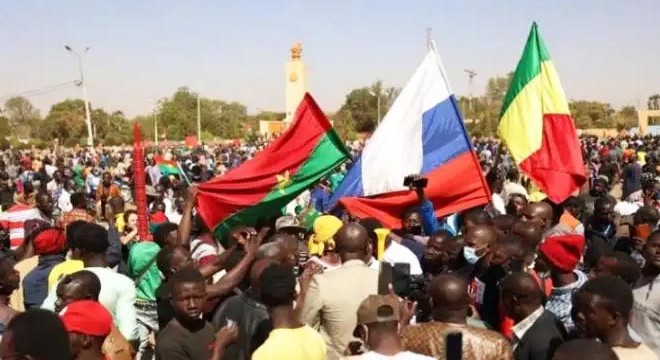 Nijer bayraklarının yanı sıra Rusya, Kuzey Kore ve Çin bayrakları da sallayan grup, "Kahrolsun Fransa" ve "Fransız askerlerini istemiyoruz" yazılı dövizler taşıdı.