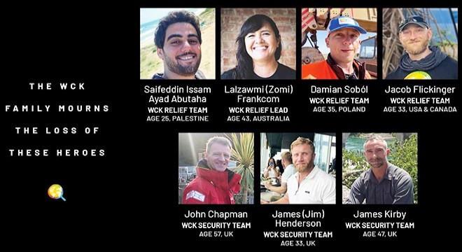 WCK dün yaptığı açıklamada, 7 çalışanının Gazze’ye gönderilen 100 tondan fazla insani gıda yardımını gemiden depolara indirdiği sırada konvoya düzenlenen saldırı ile öldüğünü duyurmuştu. Yapılan açıklamada öldürülen 7 çalışanının kimlikleri Jacob Flickinger, John Chapman, James Henderson, James Kirby, Lalzawmi (Zomi) Frankcom, Damian Sobol ve Saifeddin Issam Ayad Abutaha olarak açıklandı.
