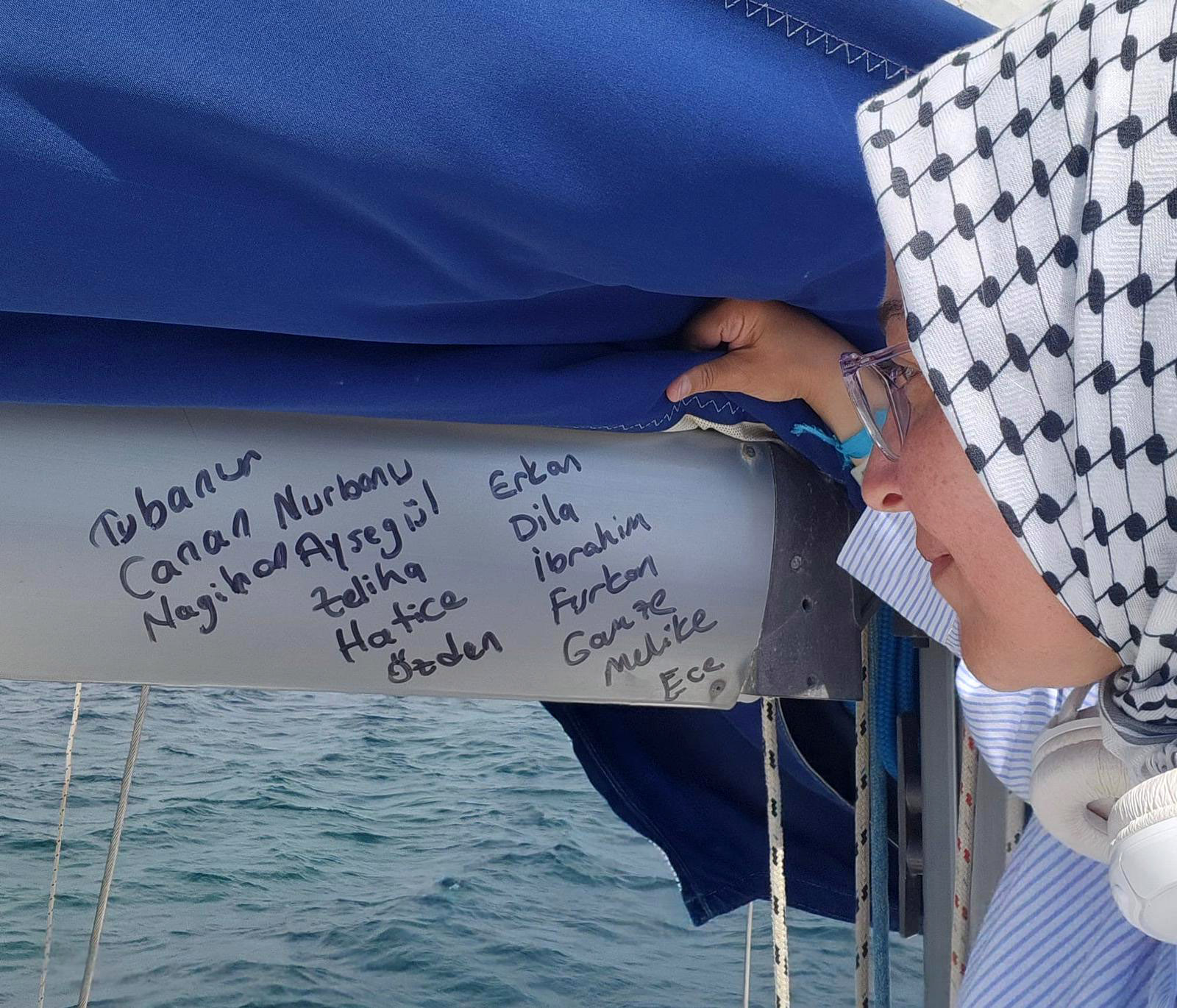 Küresel Sumud Filosu’ndaki İtalya’nın Sicilya Adası’ndan 20 gün önce yola çıkan 'Morgana' adlı teknedeki Kadın ve Demokrasi Vakfı (KADEM) İletişimden Sorumlu Genel Müdür Yardımcısı, gazeteci, aktivist Semanur Sönmez Yaman, eşi Erkan, çocukları Furkan, Dila, İbrahim, gelini Gamze ve torunları Melike ve Ece Yaman ile annesi Özden Sönmez, kardeşi Tuğba Nur Sönmez ve sevdiği arkadaşlarının isimlerini teknesinin direğine yazdı.