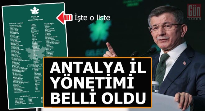 50 kişilik Yönetim Kurulu’nda önemli isimlerin yer aldığı Gelecek Partisi Antalya İl Başkanlığı’nda Yönetim Kurulu’nun yüzde 20’sinden fazlasının kadın üyelerden oluşması dikkat çekti. Gelecek Partisi’nin Antalya İl Başkanı Beytullah Demir başkanlığında Genel Merkez Yönetim Kurulu, Disiplin Kurulu ve Etik Kurulu Asil Üyelerinin listesi şöyle: