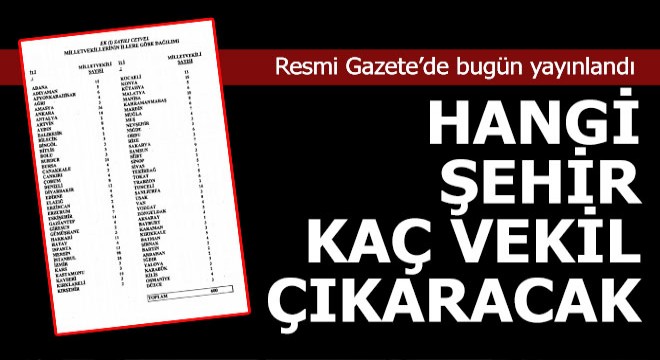 Resmi Gazete’nin bugünkü sayısındaki karara göre, İstanbul 98, Ankara 36, İzmir 28, Antalya ise 16 vekil çıkaracak. Antalya'nın çıkaracağı vekil geçtiğimiz seçime göre 2 artı. İstanbul, Eskişehir’in çıkaracağı vekil sayısı, Temmuz ayında ilan edilen listeye göre 1 artarken, Bayburt ve Ağrı’nın vekil sayıları 1’er düştü.