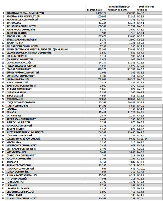 Rapora göre, yurtdışındaki temsilciliklerde oy kullanan Türk vatandaşlarının en çok bulunduğu ülke 660.780 kişiyle Almanya. Yurtışı temsilciliklerindeki oy kullanım oranının en yüksek olduğu ülke ise yüzde 1687'lik bir oranla Lüksemburg oldu.