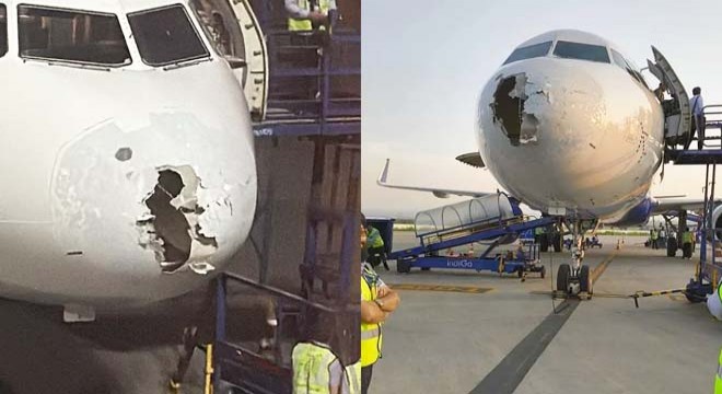 Şirket hasarın boyutuna dair detay paylaşmazken, yolcular tarafından çekilen fotoğraflar uçağın burun kısmında büyük bir delik oluştuğunu gösteriyor.