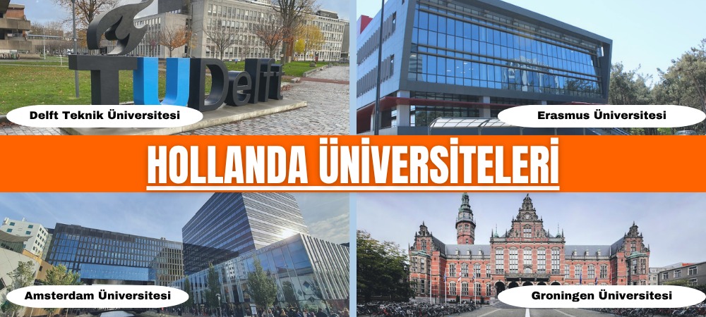 Hollanda üniversiteleri arasında öne çıkan Delft Teknik Üniversitesi, Erasmus Üniversitesi, Amsterdam Üniversitesi ve Groningen Üniversitesi’nin kampüs görsellerinin yer aldığı tanıtım görseli. Hollanda’da yükseköğrenim görmek isteyen öğrenciler için seçkin üniversiteleri gösteren bilgi amaçlı içerik.