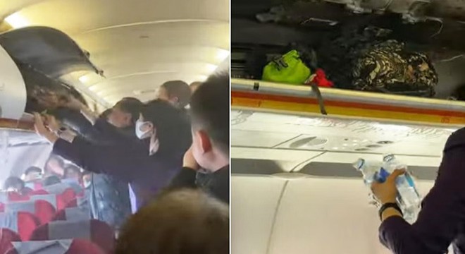 Hong Kong televizyonunun paylaştığı görüntülerde, yolcular ve kabin görevlilerinin yangını söndürmek için su şişeleri kullandıkları görüldü.