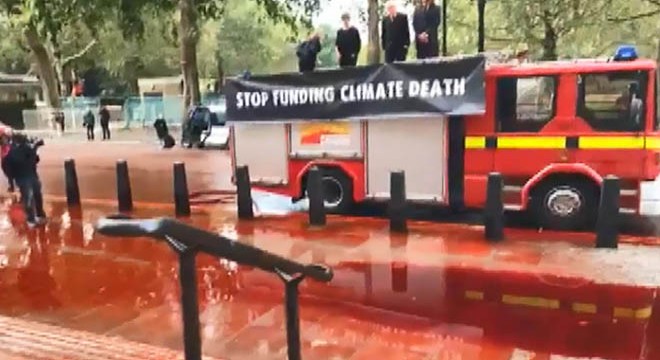 Bakanlıkların bulunduğu White Hall’deki Hazine Bakanlığı önüne itfaiye aracı getiren eylemciler, itfaiye hortumuyla bakanlık binasının duvarlarına kırmızı boya püskürttü. Kaldırımların ve bina duvarlarının kırmızı boyandığı eylem, iklim değişikliği eylemcilerinin Facebook sayfasında canlı yayınlandı.