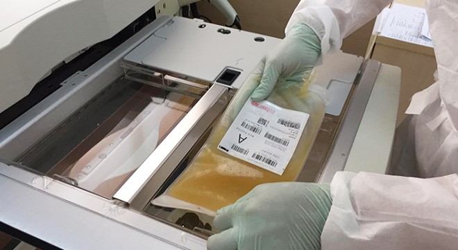 "Buna aferez cihazı deniyor. Aferez cihazından ürünü bir torba içerisinde elde ediyoruz. Onu elde ettikten sonra bağışçı kişi serbestleşiyor ama bizim işimiz devam ediyor. O ürün torbasını alacağız ve bu cihazın içine özel bir bölmeye yerleştireceğiz. Bir solüsyon bu görevi yapacak. Ama önce ultraviyoleye maruz kalıyor ve solüsyon bu şekilde patojeni inaktive edebiliyor. Yaklaşık 7 dakikalık bir işlem. Cihazın kendi bir bölmesi var. Açıp ürünleri yerleştiriyorsunuz. 7 dakika sonra patojen inaktivasyonundan emin olduğunuz bir ürünü alıp isterseniz donduruyor isterseniz hastaya gönderiyorsunuz."