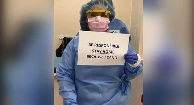 İngiltere’de koronavirüsle mücadelede 'ön cephede' yer alan devlete bağlı Ulusal Sağlık İdaresi’ne (NHS) bağlı sağlık çalışanları vatandaşlara, 'sorumlu olmaları ve evde kalmaları' çağrısında bulunduğu bir video hazırladı. Sağlık çalışanları tarafından sosyal medyada paylaşılan görüntülerde, iki sağlık çalışanının ellerinde tuttukları kartlarda, 'Sorumlu ol, evde kal', 'ellerini yıka' gibi ifadeler yer alıyor. Görüntüde sağlık çalışanlarının verdiği tam mesaj ise şöyle: