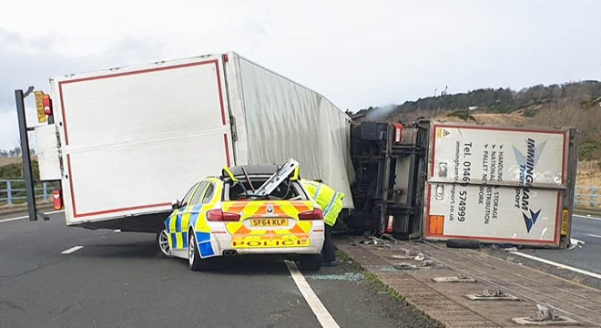 İngiltere’yi etkisi altına alan şiddetli rüzgârlar birçok bölgede hayatı olumsuz etkiliyor. Otoyolda devrilen bir kamyona müdahale için bölgeye giden polis ekibi de büyük bir kaza atlattı. Devrilen kamyon için araçlarından inen polisler çalışma yaptıkları sırada, seyir halindeki bir başka kamyon polis aracının üzerine devrildi. Kimsenin yaralanmadığı o kazayı trafik kamerası kaydetti.