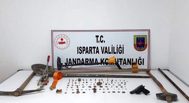 İl Jandarma Komutanlığına bağlı ekipler Şarkikaraağaç'a bağlı Beyköy Köyü'nde izinsiz kazı yapıldığı ihbarı üzerine operasyon başlattı. Yapılan baskında S.A. ve M.İ., kazı yaptıklar sırada suçüstü yakalandı. Operasyonda dedektör, kazı malzemeleri, 51 tarihi obje, 28 sikke, 2 yüzük, 1 mühür, 1 heykelcik, ruhsatsız tabanca ve 23 tabanca fişeği ele geçirildi. Ele geçirilen malzemelere el konurken, gözaltına alınan 2 şüpheli hakkında adli işlem başlatıldı.