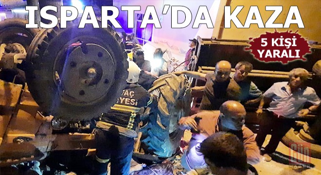 Kaza, saat 20.30 sıralarında Yalvaç ilçesine bağlı Körküler köyünde meydana geldi. C.C. adlı kadının kullandığı plakası öğrenilemeyen traktör, sürücüsünün direksiyon kontrolünü yitirmesi sonucu devrildi. Sürücü traktörün altında kalarak ağır yaralanırken, römorkta yolculuk yapan 4 kadın ise yola savrularak yaralandı.