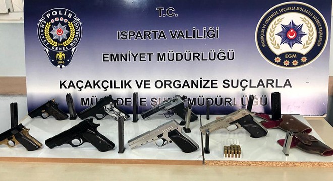 Isparta Cumhuriyet Başsavcılığı koordinesinde Kaçakçılık ve Organize Suçlarla Mücadele Şube Müdürlüğü'nce yürütülen soruşturma kapsamında silah ticareti yapmakla suçlanan 8 şüphelinin il merkezindeki adreslerine bu sabah eş zamanlı operasyon yapıldı. Operasyonlarda F.A., E.P., S.Ö., M.Ö., A.Ç., İ.D., Z.P. ve M.Ç. gözaltına alınırken, ikametlerinde yapılan aramalarda değişik çap ve markalarda 6 ruhsatsız tabanca, kurusıkı tabanca ve değişik çap ve markalarda 18 tabanca fişeği ele geçirildi. Şüphelilerin polis merkezindeki işlemlerinin sürdüğü belirtildi.