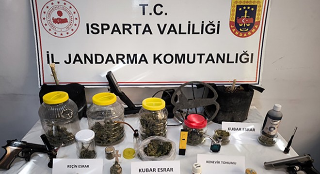 Isparta İl Jandarma Komutanlığı ekipleri Yalvaç ilçesinde 3 şüphelinin evinde uyuşturucu madde imal ve ticareti yaptıkları bilgisi üzerine operasyon başlattı. Evlerde yapılan aramada 255 gram kubar esrar, 8 gram reçine esrar, 2 kök kenevir bitkisi, 8 gram kenevir tohumu, esrar maddesi öğütme aparatı, 2 tabanca ve tarihi obje ele geçirildi. Şüpheliler hakkında 'uyuşturucu madde kullanma ve bulundurma', 'yasa dışı kenevir ekimi' ve '2863 sayılı kültür ve tabiat varlıklarını koruma kanununa muhalefet' suçlarından adli işlem başlatıldı.
