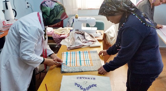Kurs öğretmeni Canan Halıcı, "Sıfır atık projesine kursiyerlerimizle birlikte katkı yapmak istedik. Neler yapabiliriz diye düşünürken elimizdeki parça kumaşlardan, eski başörtülerden alışveriş çantası yapmaya karar verdik. Sıfır maliyetle hem ev ekonomisine hem de ülkemizin geleceğine sahip çıkıyoruz" dedi.