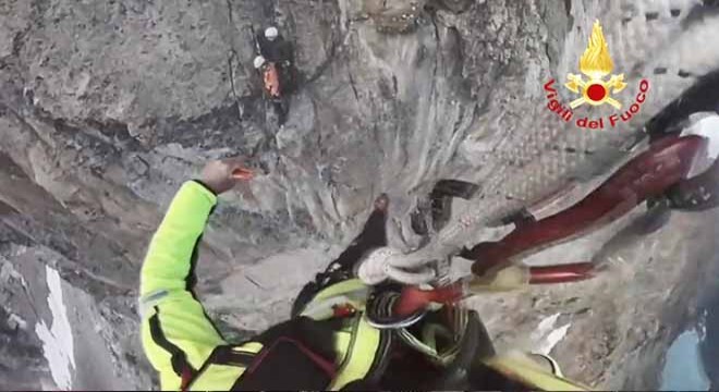 İtalyan itfaiyesi Vigili del Fuoco, dağcıların Turin kentinin kuzeyindeki Lago di Valsoera’da mahsur kaldığını duyurdu. Bölgeye intikal eden itfaiye helikopterinden halatla iniş yapan itfaiye personeli, dağcıları 3 bin metrede bulundukları yerden güvenli bir şekilde helikoptere çekti. Vigili del Fuoco, operasyonu, “Zamana ve şiddetli rüzgara karşı bir yarış” ifadeleriyle tanımladı.