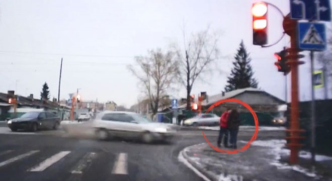 Rusya’nın Kemerovo kentinde meydana gelen kazada, kontrolden çıkan otomobil, kaldırımda sarılan 18 yaşındaki bir genç ve kıza çarptı. Başka bir otomobilin araç kamerasına yansıyan görüntülerde, otomobilin sertçe çifte çarptığı, genç çiftin yol kenarındaki çitlere savrulduğu görüldü.
