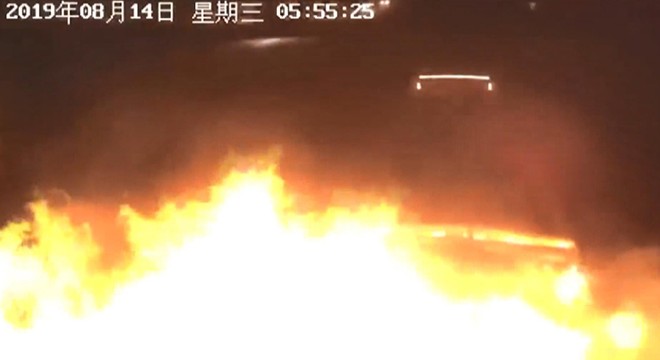 Kaza, Siçuan eyaletindeki Deyang şehrinde meydana geldi. Kırmızı ışıkta duran kamyona arkadan çarpan diğer kamyon, çarpışma sonrası aniden alev aldı. Güvenlik kamerasınca kaydedilen görüntülerde, çevredekilerin yanan kamyona koştuğu ve kamyon sürücüsünü kollarından çekerek uzaklaştırdıkları görüldü.