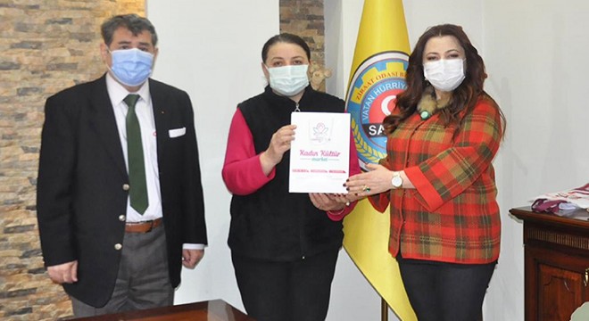 Ziyarette Kaymakam Eflatun Can Tortop'un eşi Reyhan Tortop, Kadın Kültür Evi'nde kadınlar tarafından üretilen keçe ile yapılan organik sabunları Ziraat Odası Başkanı Fatma Toptaş'a ve çalışanlara hediye etti.