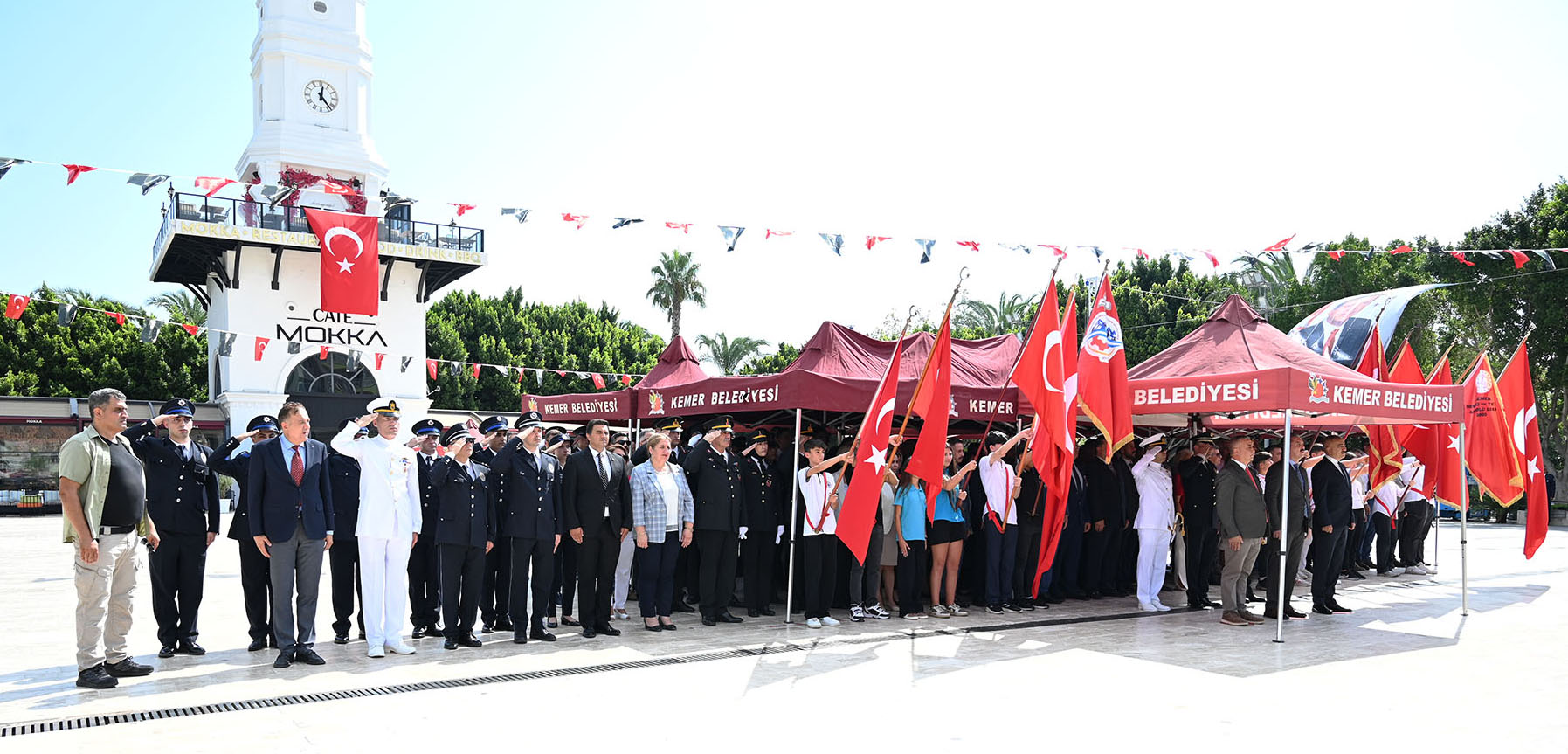 Kemer Cumhuriyet Meydanı'nda düzenlenen törene Kemer Kaymakamı Ahmet Solmaz, Kemer Belediye Başkan Vekili Mehmet Akın, Kemer Cumhuriyet Başsavcı Vekili Aytekin Tetik, Kemer Jandarma Komutanı Ömer Seyhan, Kemer Emniyet Müdürü Furkan Gediktaş, Kemer Sahil Güvenlik Komutanı Burak Gökçe Gökmen, Kemer Belediye Başkan Yardımcısı Semih Top, Kemer Belediye meclis üyeleri Cansın Efir, Ali Akar, Mustafa Çelik, Sema Özdemir, muhtarlar, siyasi parti temsilcileri, gaziler, şehit aileleri ve yakınları, sivil toplum kuruluşlarının temsilcileri ile vatandaşlar katıldı.