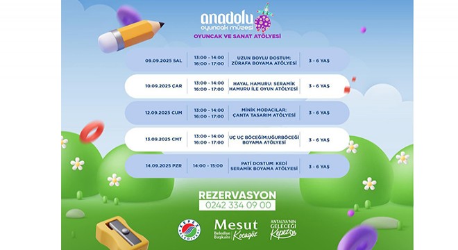 Çocuklara yönelik her hafta farklı atölye çalışmaları düzenleyen Anadolu Oyuncak Müzesi, bu hafta etkinliklere 'Uzun Boylu Dostum: Zürafa Boyama Atölyesi' ile başlıyor. Minik eller, 10 Eylül Çarşamba, Hayal Hamuru: Seramik Hamuru ile Oyun atölyesi, 12 Eylül Cuma Minik Modacılar: Çanta Tasarım Atölyesi, 13 Eylül Cumartesi Uç Uç Böceğim: Uğur Böceği Boyama Atölyesi, 14 Eylül Pazar Pati Dostum: Kedi Seramik Boyama Atölyesi’nde bir araya gelecek. Atölye çalışmaları 13.00– 14.00 ve 16.00– 17.00 saatleri olmak üzere iki ayrı seansta gerçekleştirilecek. Ancak, 14 Eylül Pazar günü, 'Pati Dostum: Kedi Seramik Boyama Atölyesi' tek seans halinde 14.00 – 15.00 saatleri arasında yapılacak. Kepez Belediyesi, 3- 6 yaş grubuna özel olarak düzenlenen atölye çalışmaları ile miniklerin hem eğlenmesini hem de öğrenmesini amaçlıyor. Çocuklar, sanatın farklı alanlarında yaratıcı çalışmalar yaparken el becerilerini geliştiriyor, hayal güçlerini özgürce ortaya koyabiliyor.