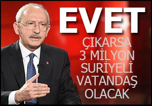 Kılıçdaroğlu, “Emin olun, ‘Evet’ oyu çıktıktan sonra ilk yapacakları iş, 3 milyon Suriyeliye de vatandaşlık vermek. Evet, söylediler bunu, ‘Suriyelilere vatandaşlık vereceğiz, referandumu bekliyoruz.’ ‘Hayır’ çıkarsa veremeyecekler. ‘Evet’ çıkarsa 3 milyon Suriyeliyi götürüp vatandaşlığı verecekler. Diyorsanız ki ‘3 milyon Suriyeliye versinler vatandaşlık. Benim çocuğum varsın işsiz olsun, ne olacak. Esnafım kazanmıyor, öbürü hem kazanıyor, hem vergi vermiyor’ diyorsanız, bir mesele yok. Tercih yine sizin tercihiniz. Bu kadar açık, bu kadar net söylüyoruz. Türkiye bir maceranın içine sokulmamalı” diye konuştu.