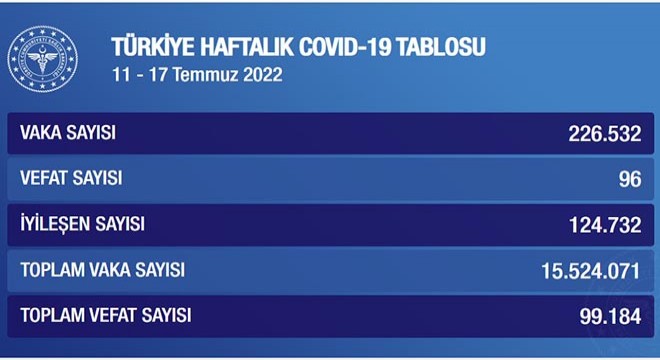 Sağlık Bakanlığı tarafından açıklanan haftalık Covid-19 tablosuna göre, 11-17 Temmuz tarihleri arasında 226 bin 532 kişi koronavirüse yakalandı. Koronavirüsten dolayı 96 kişi hayatını kaybederken, 124 bin 732 kişinin de karantina ve tedavisi sona erdi.