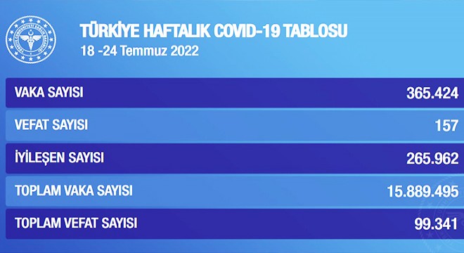Sağlık Bakanlığı tarafından açıklanan haftalık Covid-19 tablosuna göre, 18-24 Temmuz tarihleri arasında 365 bin 424 kişi koronavirüse yakalandı. Koronavirüsten dolayı 157 kişi hayatını kaybederken, 265 bin 962 kişinin de karantina ve tedavisi sona erdi.