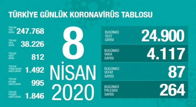 Tabloya göre, 8 Nisan 2020 tarihi itibariyle toplam vaka sayısı 38 bin 226, toplam hayatını kaybedenlerin sayısı 812'ye yükseldi.