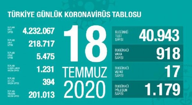 Sağlık Bakanı Fahrettin Koca'nın Twitter hesabından paylaştığı tabloya göre; son 24 saatte 40 bin 943 test yapıldı, 918 kişide daha koronavirüs tespit edildi. Virüs nedeniyle 17 kişi hayatını kaybederken 1179 kişi de iyileşti. Bugünkü verilerle toplam test sayısı 4 milyon 232 bin 67, toplam vaka sayısı 218 bin 717, toplam vefat sayısı 5 bin 475, toplam yoğun bakım hasta sayısı 1231, solunum cihazına bağlı toplam hasta sayısı 394, toplam iyileşen hasta sayısı 201 bin 13 oldu.