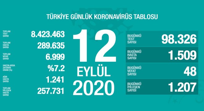 SAĞLIK Bakanı Fahrettin Koca, "Türkiye Günlük Koronavirüs Tablosu'nu paylaştı. Son 24 saatte yapılan 98 bin 326 testten 1509'u pozitif çıktı, yaşamını yitiren 48 kişi ile toplam can kaybı 6 bin 999 oldu. Toplam iyileşen hasta sayısı ise 257 bin 731'e yükseldi."