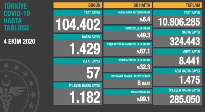Sağlık Bakanı Koca: Bugün yapılan 104.402 test sonucunda 1.429 yeni hasta tespit edildi. Ağır hasta sayımız 1.475. Rehavete kapılmamalı ve tedbiri elden bırakmamalıyız. Birlikte tedbirlere uyarak virüse fırsat vermemeliyiz. Birlik olursak kazanan biz oluruz