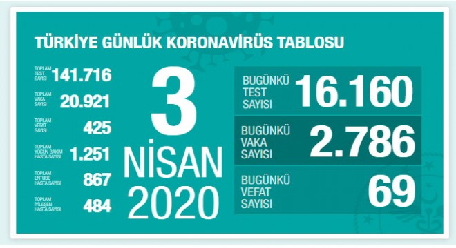 Son 24 saatte 16 bin 160 test yapıldı. 2786 daha pozitif vaka tespit ettik. Toplam vaka sayımız 20 bin 921 oldu. Bugün kaybettiğimiz 69 kişiyle can kaybımız 425'i buldu.