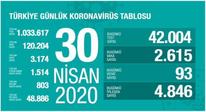 Sağlık Bakanı Fahrettin Koca, 'Türkiye Günlük Koronavirüs Tablosu'nu paylaştı. 42 bin bin test yapıldı, 2 bin 615 yeni tanı konuldu. Vefat eden 93 kişi ile birlikte toplam can kaybı 3 bin 171 oldu. Toplam iyileşen hasta sayısı ise 48 bin 886'ya yükseldi.