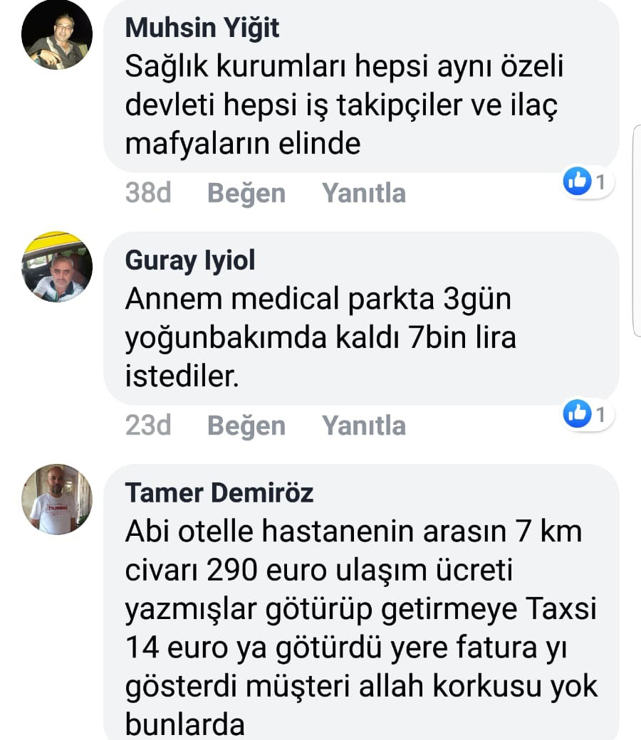 “Şimdi bir turist geldi, kulağı için bir özel hastaneye gitmiş, kulağını yıkamışlar, bir ilaç yazmışlar. İlacın ucuz olduğunu görünce hastanede çok para aldılar dedi. Ne kadar diye sorunca, 500 € para almışlar... Bunu denetleyen bir sağlık bakanlığı yok mu. Hastanın, Türkü, turisti olur mu? Bu nasıl bir ülke.Bu ülkeye iyi turist geliyor yinede... Yazık, denetim yok,hesap sormak yok..,”